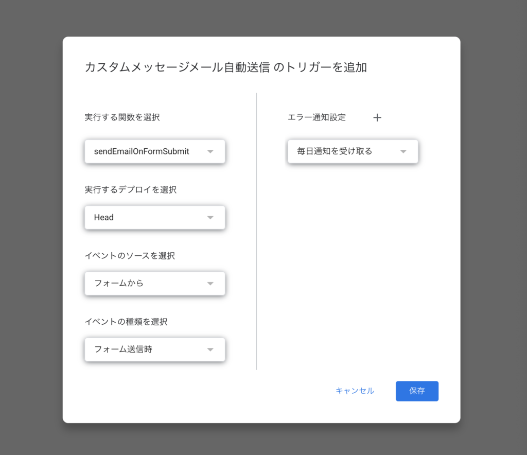 }フォーム回答時に実行される様にトリガ設定を行う