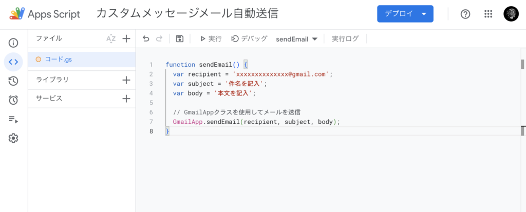 var recipient = '送りたい宛先のメールアドレスを記入';