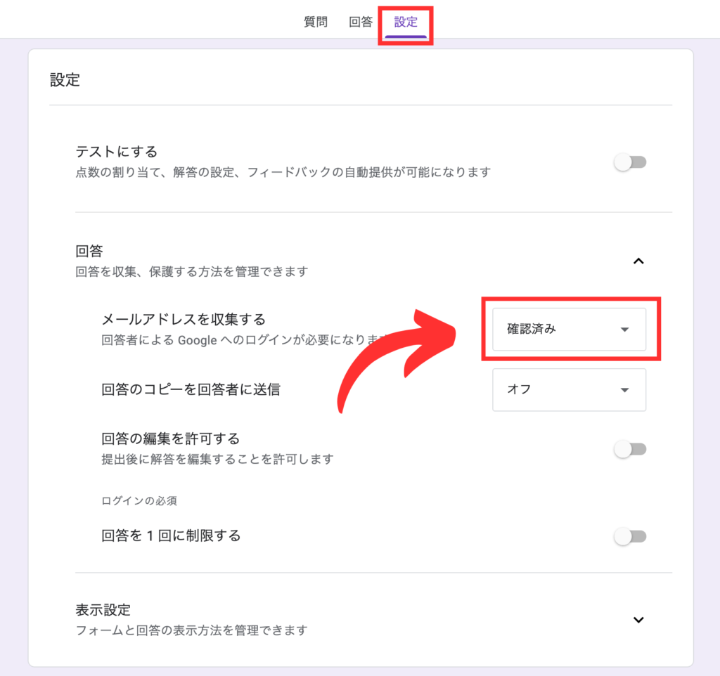今回の例では、質問は以下の様に設定。そして「設定」で「メールアドレスを収集する」の項目を「確認済み」としておいてください。