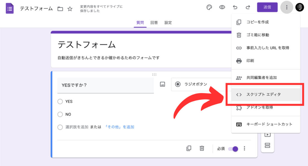 それでは、このスクリプトをGoogleフォームの回答に組み込んで、自動応答機能を実現していきましょう。