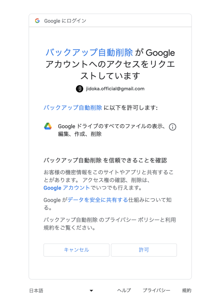 そうする事で、GASが「Google ドライブのすべてのファイルの表示、編集、作成、削除」の権限を使う事ができます。