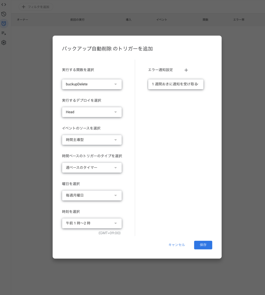 今回は毎日実行する必要がないコードなので、週1程度のペースで自動的に実行される様に、下記の様な設定でトリガを設定しました。