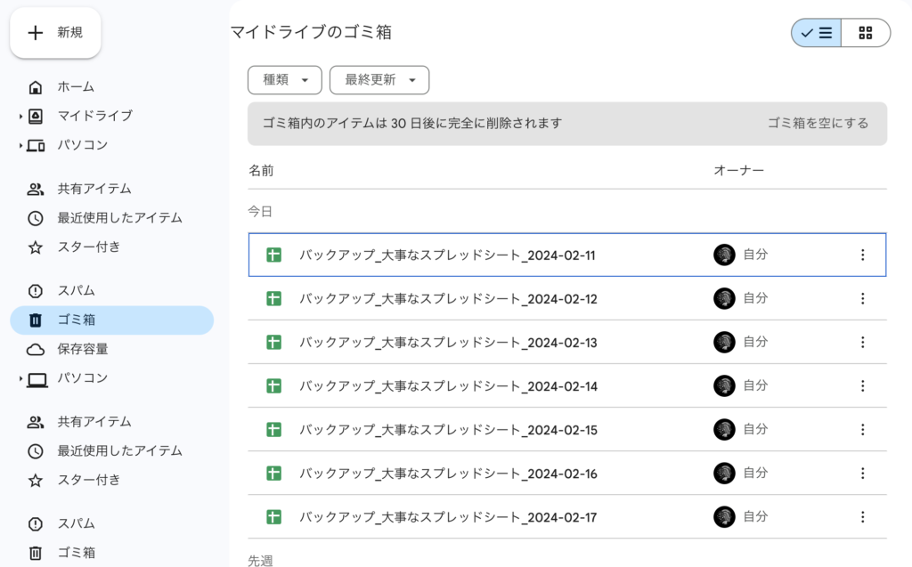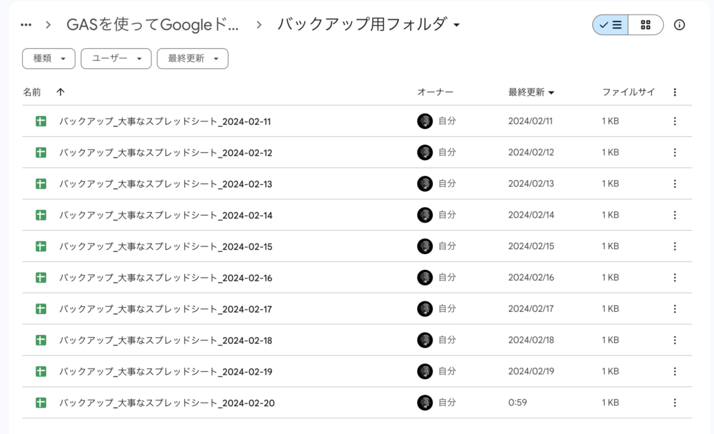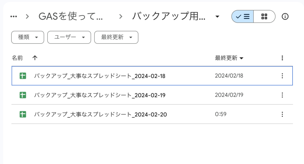 今回は、このフォルダ内に入っているバックアップファイル(スプレッドシート)について、直近で作られた3ファイルを残し、それ以外は削除する様にGASを書いていきたいと思います。