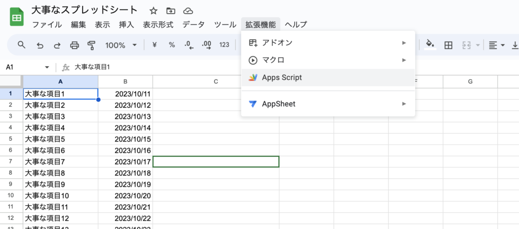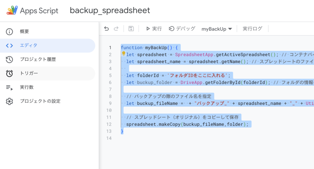 それでは、実際にこの大事なスプレッドシートのバックアップを取るプログラムを作成していきましょう。