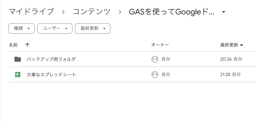 今回は、バックアップしたいファイルである「大事なスプレッドシート」と同じディレクトリに、バックアップ用のフォルダを作成しました。(任意の場所で大丈夫です)