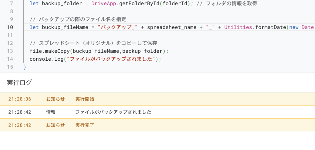 4行目では、バックアップを取りたいファイルを指定しています。2行目で取得したspreadsheetを用いて、ファイルIDを取得し、DriveApp.getFileById()でファイルの情報を取得しています。
