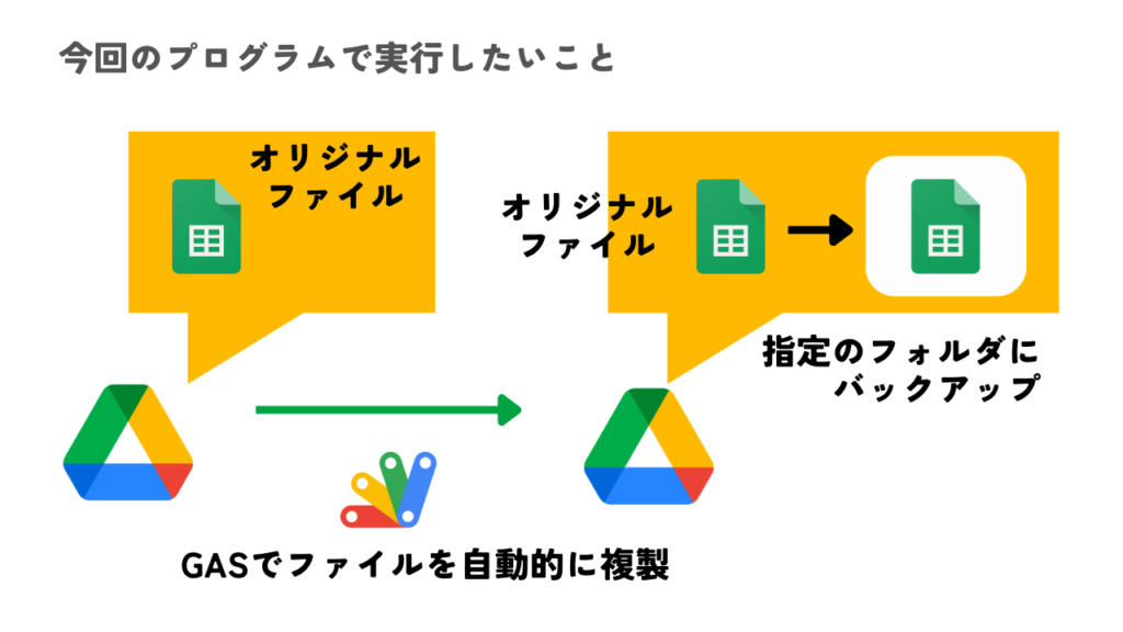 今回の事例では、オリジナルファイルをスプレッドシートとして、指定フォルダへのバックアップを実現していきます。やりたいことを図示すると、以下のような構図になります。